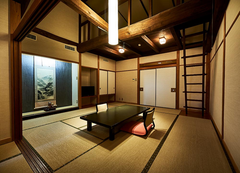 お部屋間のジョイントをつなげば、最大9名様のお部屋としてご宿泊いただけます。すべてのお部屋は湖側。温泉半露天風呂とマッサージチェア完備。